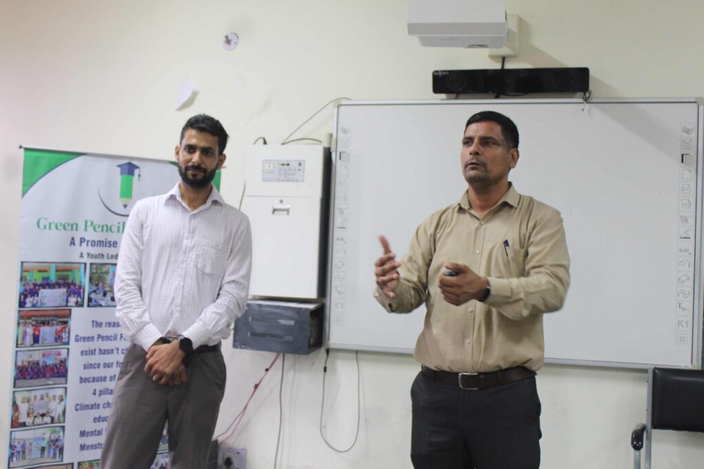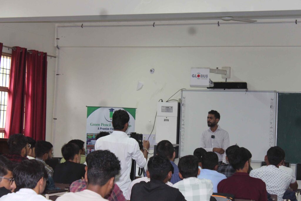 The session was led by Professor Anil Kumar Gillawat, Training & Placement Officer. Representatives from the Green Pencil Foundation, including Mr. Sandy Khanda and Mr. Divyansh Gandhi, guided students on waste management, water conservation, energy efficiency, and reducing single-use plastics.