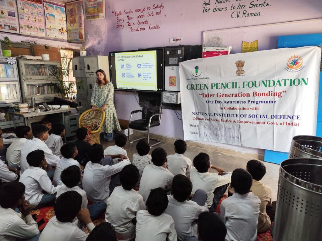Faridabad, September 19, 2025 — Strengthening its ongoing partnership with the National Institute of Social Defence (NISD) under the Ministry of Social Justice and Empowerment, Government of India, the Green Pencil Foundation conducted another sensitisation session on Intergenerational Bonding at Government Senior Secondary School, Village Chhainsa, Ballabgarh.